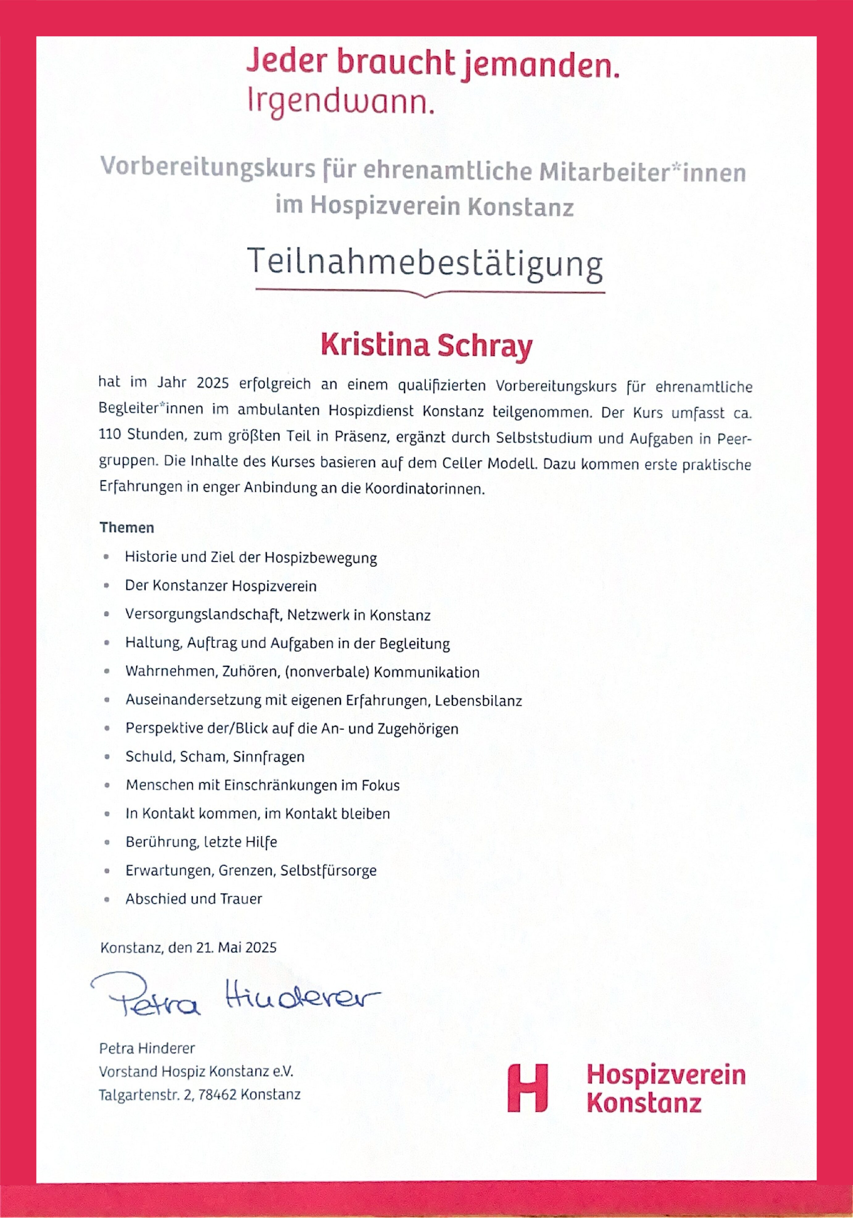 Als Trauerrednerin bin ich es gewohnt, Menschen in schwierigen Zeiten beizustehen. Diese Erfahrung vertiefe ich nun durch mein ehrenamtliches Engagement im Hospiz. Seit Frühjahr 2025 bin ich ausgebildete Begleiterin für Menschen, die sich dem Lebensende nähern oder einfach Gesellschaft und ein offenes Ohr suchen – sei es in einem Pflegeheim oder in anderen Lebenssituationen. Die Ausbildung hat mir wertvolle Einblicke geschenkt und mich darauf vorbereitet, Ihnen oder Ihren Angehörigen mit Empathie und Präsenz zur Seite zu stehen.