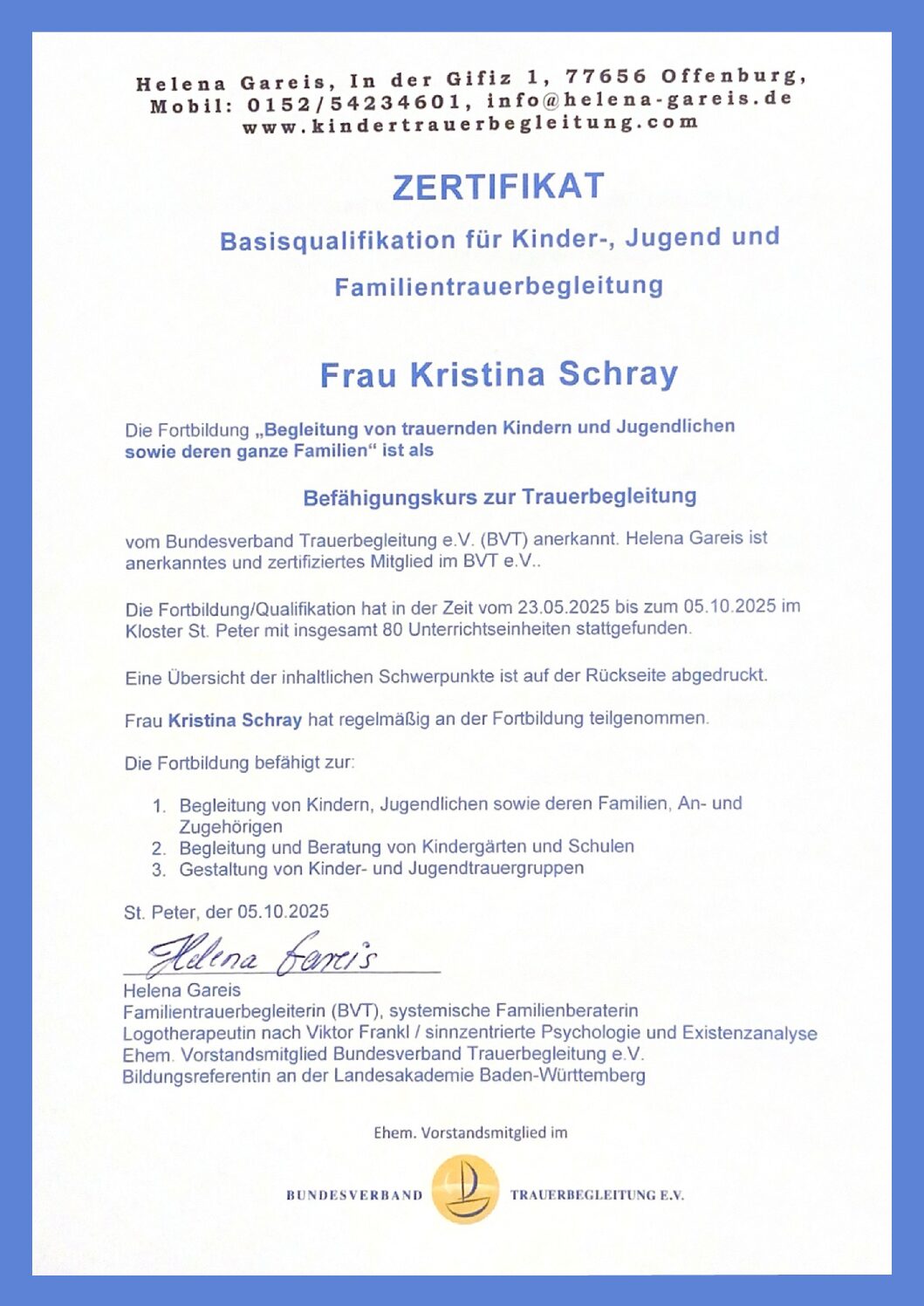 Meine Arbeit als Trauerrednerin hat mich gelehrt, wie wichtig ein geschützter Raum für den Abschied ist. Deshalb habe ich meine Expertise nun gezielt erweitert: Mit dem Zertifikat besitze ich die Basisqualifikation für Kinder-, Jugend- und Familientrauerbegleitung.